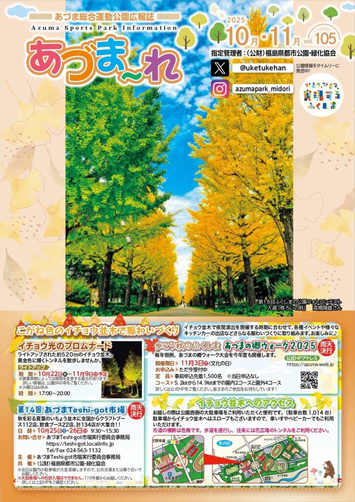 ホーム あづま〜れ あづま〜れ あづま総合運動公園広報誌 あづま~れ あづま~れ最新刊を発行しました。 暑さが和らぎ、過ごしやすい気温の日が増えてきました。 秋の気配を感じながらの散策や、広場でのピクニック、木陰のベンチで読書などはいかがでしょうか? 今月号ではイベント情報をたくさんご紹介していますので、ぜひご来園ください♪ 広報誌「あづま~れ」vol.105 発行! バックナンバー 広報誌「あづま~れ」Vol.104 広報誌「あづま~れ」Vol.103 広報誌「あづま~れ」Vol.102 広報誌「あづま~れ」Vol.101 広報誌「あづま~れ」vol.100 広報誌「あづま~れ」vol.99