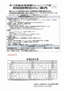 ホーム インフォメーション お知らせ体育館トレーニング室初回説明会のご案内(4月) 体育館トレーニング室初回説明会のご案内(4月) 2026/04/01 お知らせ 体育館トレーニングを初めて使う方は、初回説明会を受講していただく必要があります。下記案内をご覧ください。