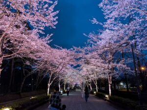 体育館南の桜並木を会場に「サクラ光のプロムナード2026」を下記の通り開催します。LED照明40基を使用した桜のライトアップをお楽しみください。
