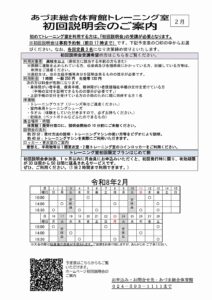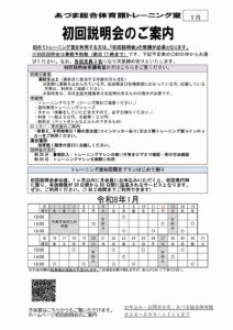ホーム インフォメーション お知らせ体育館トレーニング室初回説明会のご案内(1月・2月) 体育館トレーニング室初回説明会のご案内(1月・2月) 2026/01/17 お知らせ 体育館トレーニングを初めて使う方は、初回説明会を受講していただく必要があります。下記案内をご覧ください。