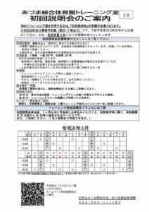 ホーム インフォメーション お知らせ体育館トレーニング室初回説明会のご案内(3月) 体育館トレーニング室初回説明会のご案内(3月) 2026/02/15 お知らせ 体育館トレーニングを初めて使う方は、初回説明会を受講していただく必要があります。下記案内をご覧ください。