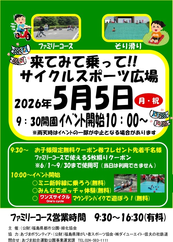 ●5月5日『こどもの日』は来てみて乗ってサイクル広場2026を開催します。ご来場お待ちしております。