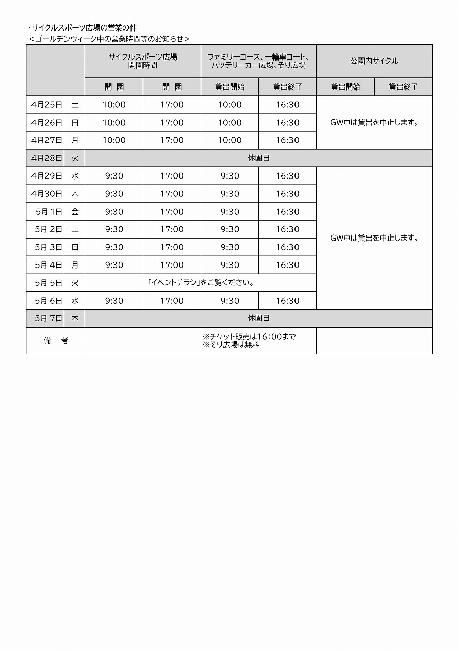 ●連休中のサイクルスポーツ広場の利用時間について